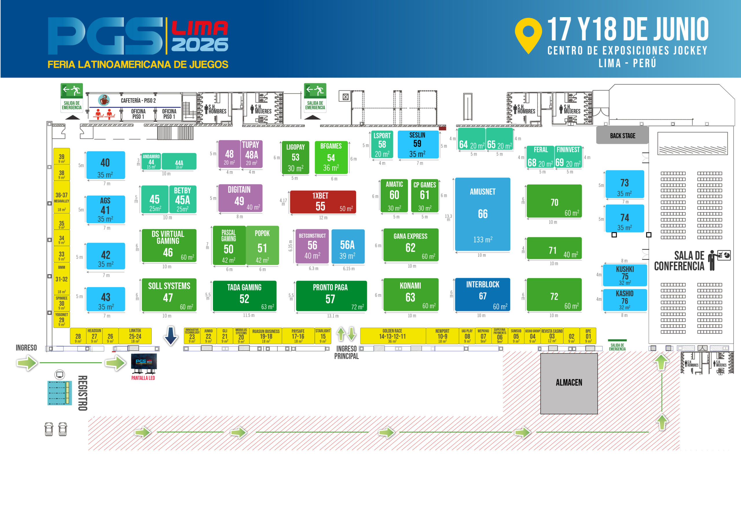 Visualiza el Plano PGS 2026, ubica el recinto principal de la Expo, los stands de tu interés y la sala de conferencias. Una guía práctica para orientarte y maximizar tu experiencia en la feria.